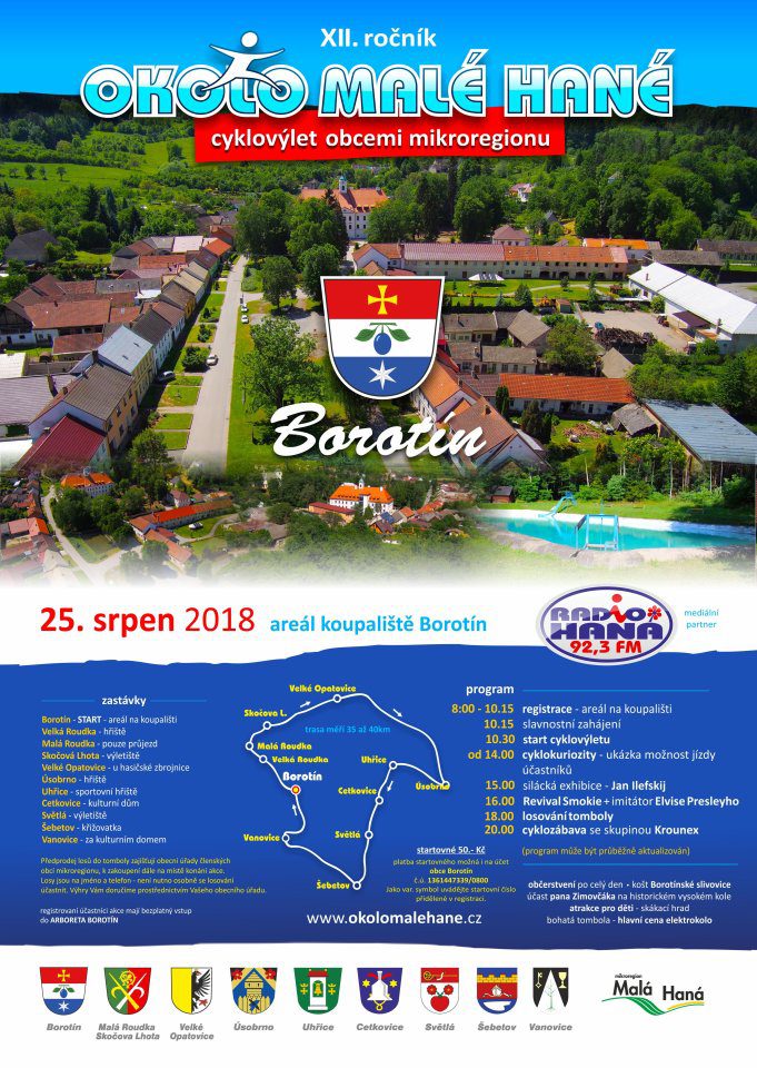 Dvanáctý ročník cyklovýletu Okolo Malé Hané se uskutečnil v sobotu 25. srpna 2018. Start i cíl akce byl tradičně situován do obce Borotín, konkrétně do areálu místního koupaliště, kde měli účastníci zázemí a možnost občerstvení i odpočinku.